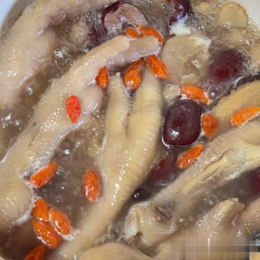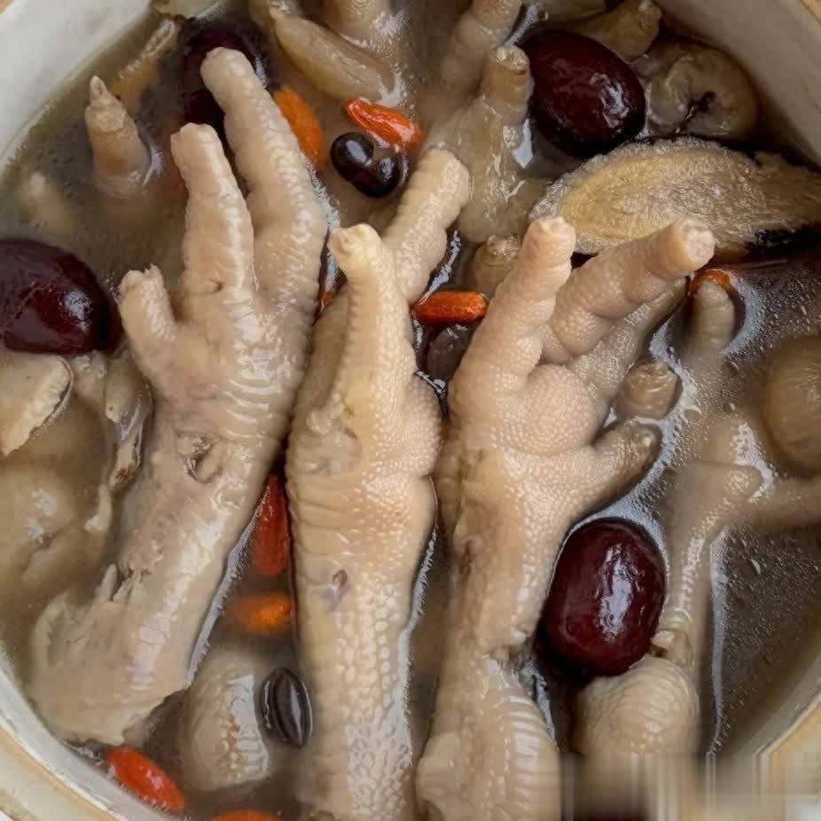 3️⃣将鸡爪放入药膳汤中,小火再炖20分钟,出锅前加枸杞、盐调味。