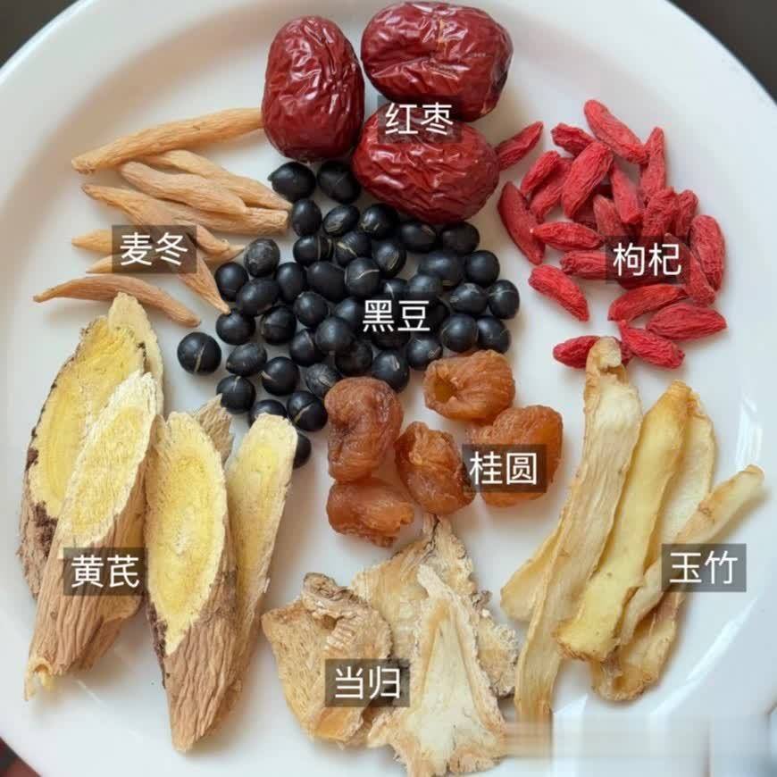 准备食材:鸡爪8只、当归10g、黄芪15g、玉竹8g、麦冬8g、黑豆20g、红枣5颗、桂圆肉10粒、枸杞1小把